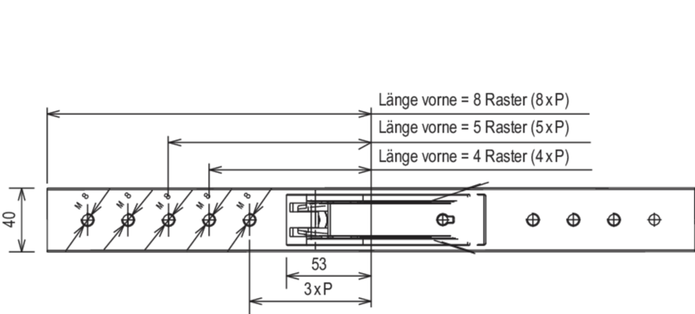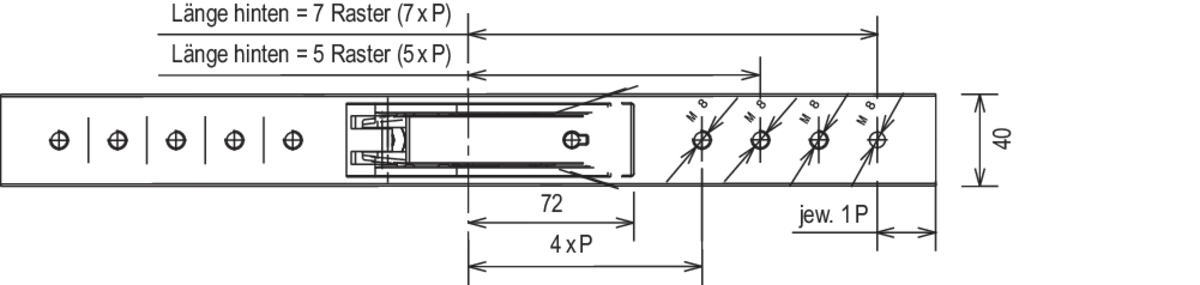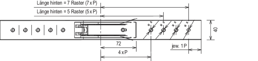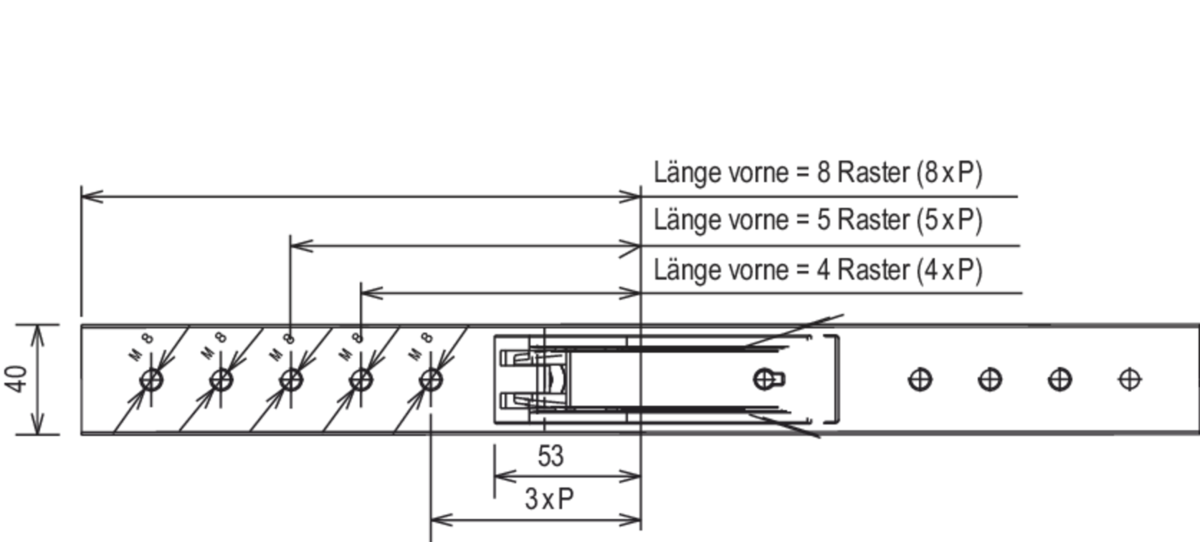 Min. 4 rasters (0 schroefdraad M8) en max. 8 rasters (4 schroefdraad M8).